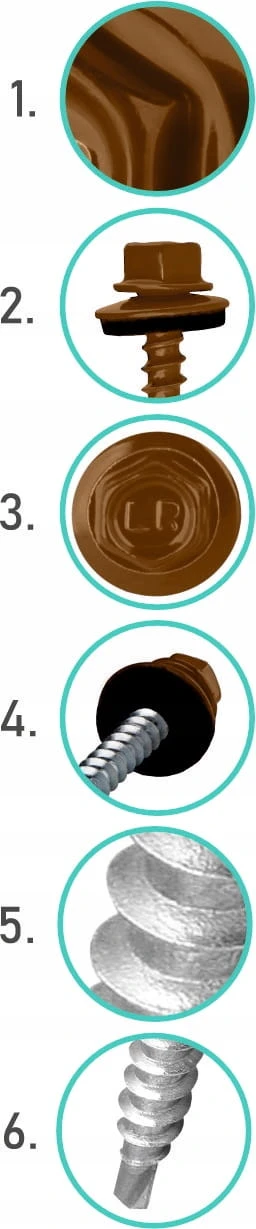 Łączniki samowiercące gwintujące wykonane ze stali węglowej utwardzonej powierzchniowo, ocynkowane elektrolitycznie, ze zredukowanym punktem wiercącym, gwintem do drewna oraz z łbem sześciokątnym, ze zmontowaną podkładką stalową z nawulkanizowanym EPDM.