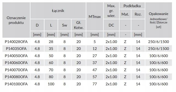 - Minimalna grubość mocowanej blachy: 1x0,5mm