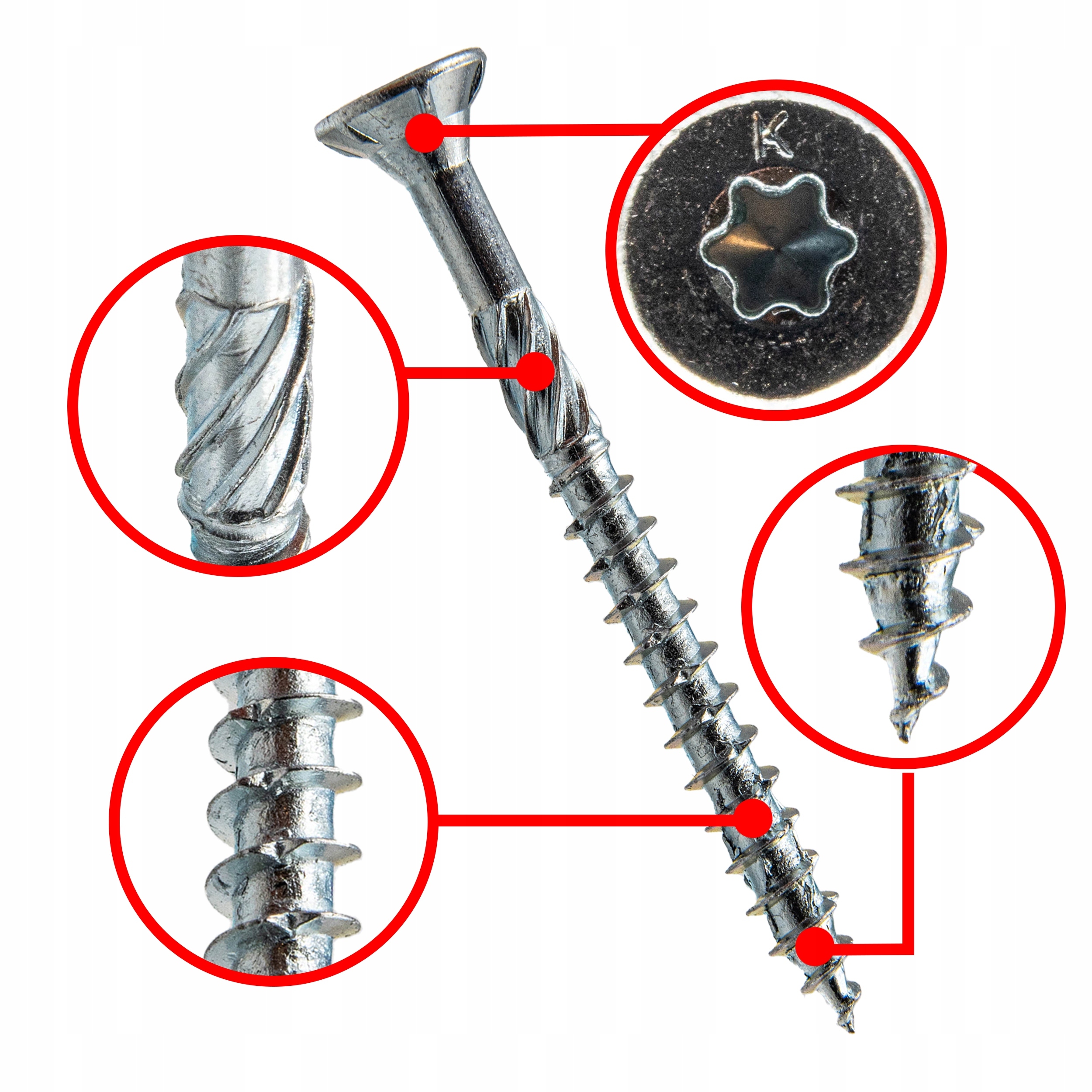 - Karby tnące - Specjalne karby tnące na gwincie przecinają włókna struktury drewna podczas wkręcania.