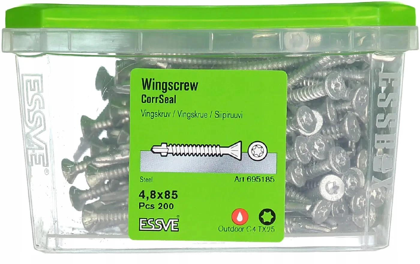 Wkręt wykonany z hartowanej stali węglowej zabezpieczony powłoką CorrSeal w klasie antykorozyjnej C4. Wkręt samowiercący i samogwintujący wyposażony w skrzydełka rozwiercające mocowane elementy z drewna. Gwint z 4 rowkami tnącymi, które zmniejszają moment dokręcający. Stożkowy łeb wkrętów z gniazdem TX, z frezami pod łbem ułatwiającymi licowanie z powierzchnią mocowanego elementu.