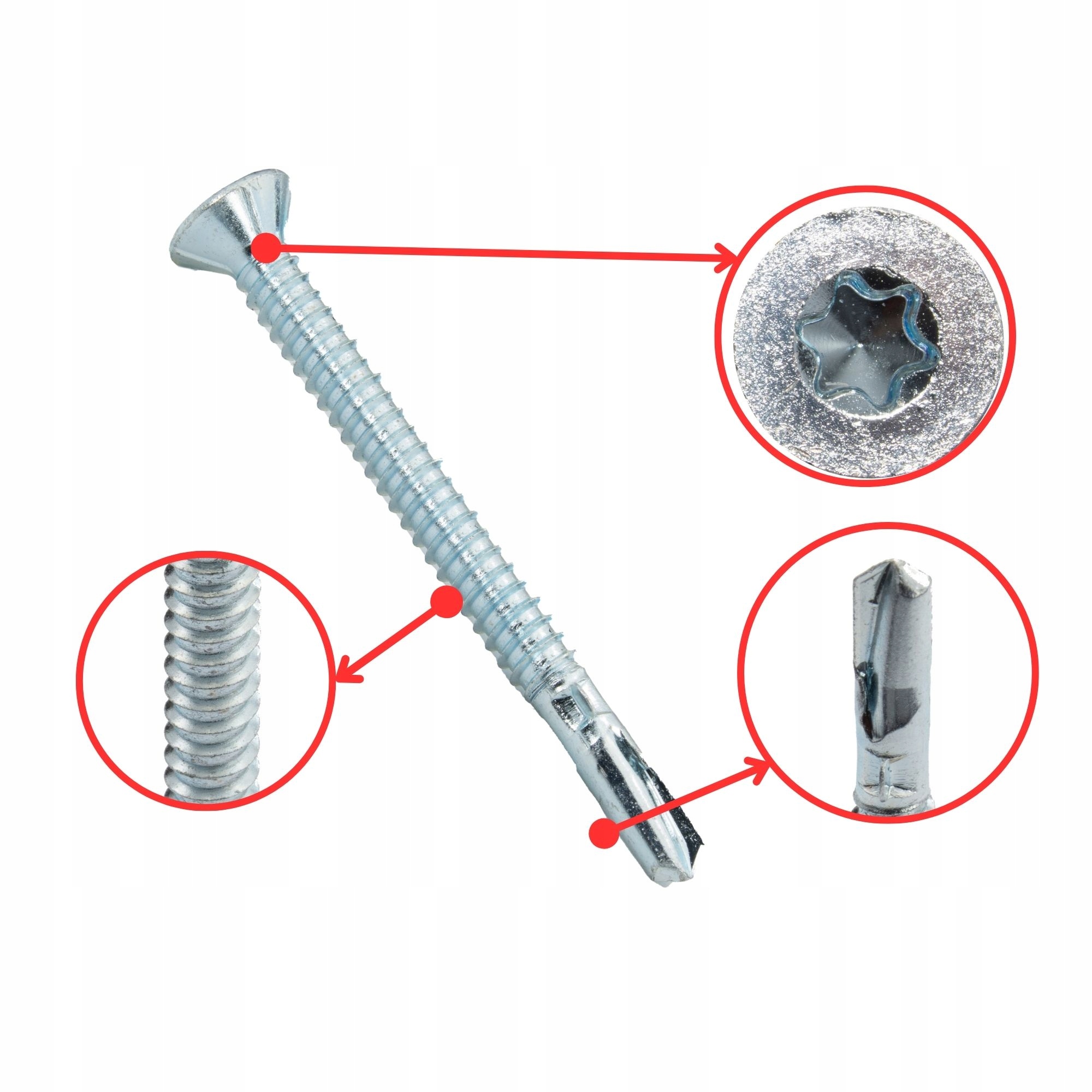 Wkręt wykonany jest ze stali węglowej utwardzonej powierzchniowo w powłoce cynkowej. Posiadają łeb stożkowy pozwalający na zlicowanie wkręta z płaszczyzną elementu mocowanego, a ostrze wiercące umożliwia przewiercenie zarówno elementu drewnianego, jak i metalowego.